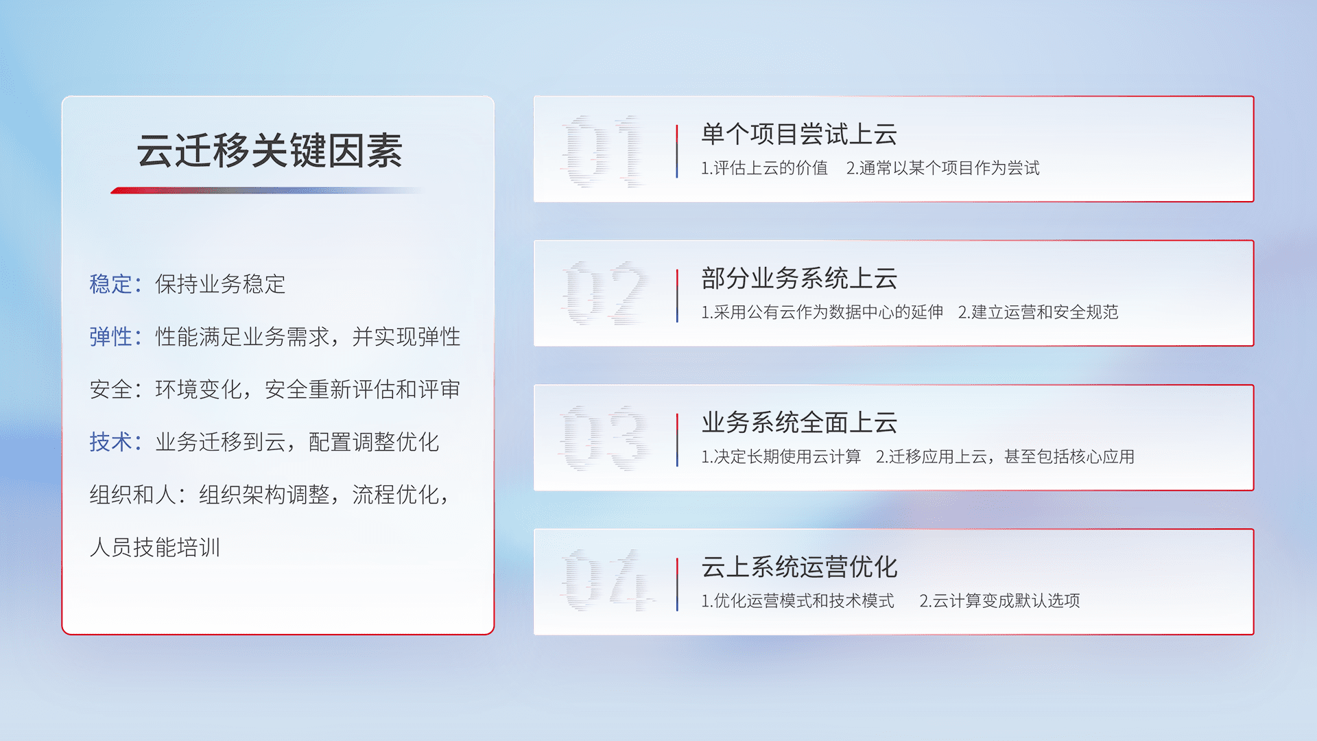 结合实际业务,,从规划设计、、、云平台选型、、、、云原生改造、、数据迁移、、集成交付,,迁移全过程为客户识别最佳上云路径,,,做好风险识别管理,,,,设计网络架构、、、、身份权限、、安全审计合规、、操作审计、、日志审计、、、、监控告警策略、、、、多站点容灾设计等,,对云上基础设施进行整体规划,,提升IT治理水平,,以满足弹性、、、、高可用、、、高性能的需求。。